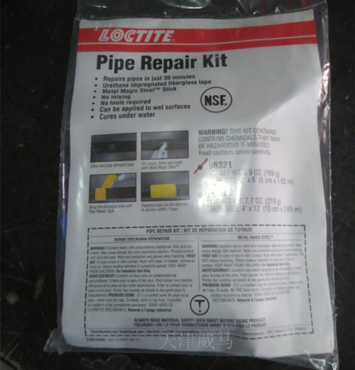 管子修理包是聚胺脂浸漬過的玻璃纖維帶,用水激活,可對金屬、塑料和復(fù)合管子進(jìn)行臨時(shí)可靠的修理,內(nèi)含金屬魔力膠棒和手套以及浸漬聚氨酯的玻璃纖維帶。10分鐘內(nèi)固化。符合USDA標(biāo)準(zhǔn),可偶爾與食品接觸。